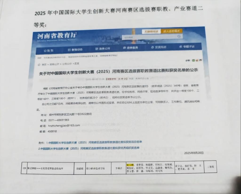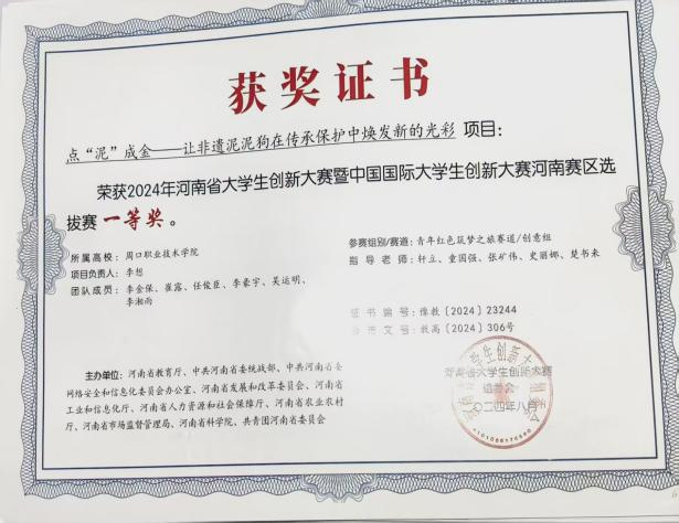 竞赛赛场是李想“蓄力”发力的舞台。她带领团队攻坚克难,累计斩获30余项竞赛奖项,涵盖国际赛一等奖1项、国赛三等奖2项、省赛一等奖8项等;还以第一申请人身份申请1项自主知识产权,团队共申请3项,其事迹被周口电视台、学习强国等媒体报道。在“实践”层面,李想聚焦淮阳泥泥狗非遗传承困境,带领团队走访传承人学习捏制技艺,依托专业知识搭建数字档案资源库,制作的非遗宣传纪录片在主流平台收获百万级浏览量,还推动该非遗文化与孟加拉等国开展跨文化交流。