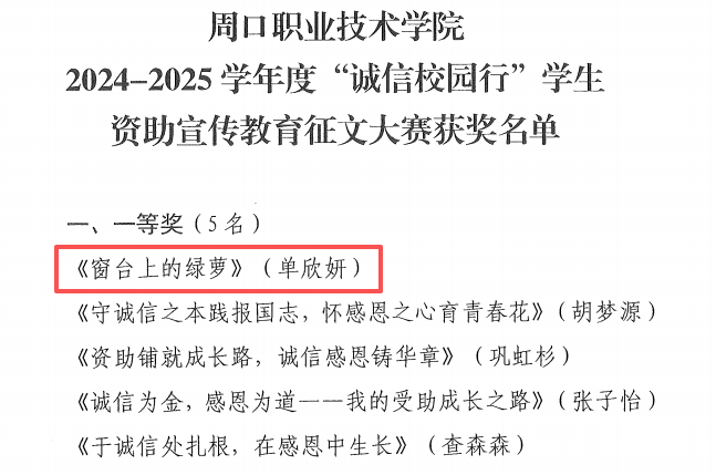 2025年5月15日,第18届河南省“诚信校园行”学生资助宣传教育活动校级评选结果公布,威廉希尔学子单欣妍同学的作品《窗台上的绿萝》凭借真挚的情感与深刻的立意荣获一等奖,该作品由王瑞雅老师与岳丽娜老师共同指导。